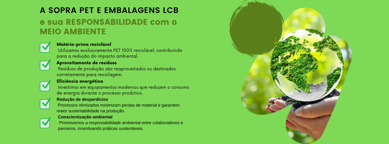 Com sede em Pedro Leopoldo – MG, a Sopra Pet e Embalagens LCB é especializada na fabricação de embalagens PET com alto padrão de qualidade, segurança e durabilidade. Atendemos empresas dos segmentos de água mineral, sucos, cosméticos, agroindústria, químico e farmacêutico, oferecendo soluções personalizadas que valorizam seu produto e sua marca. Investimos em tecnologia, inovação e compromisso com o meio ambiente para entregar o melhor em embalagens para todo o Brasil.